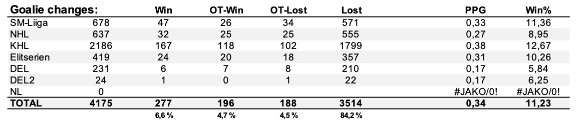 Goalie changes in different leagues and their success rate. The amount of games in different leagues vary because the leagues have been followed for different amount of seasons.